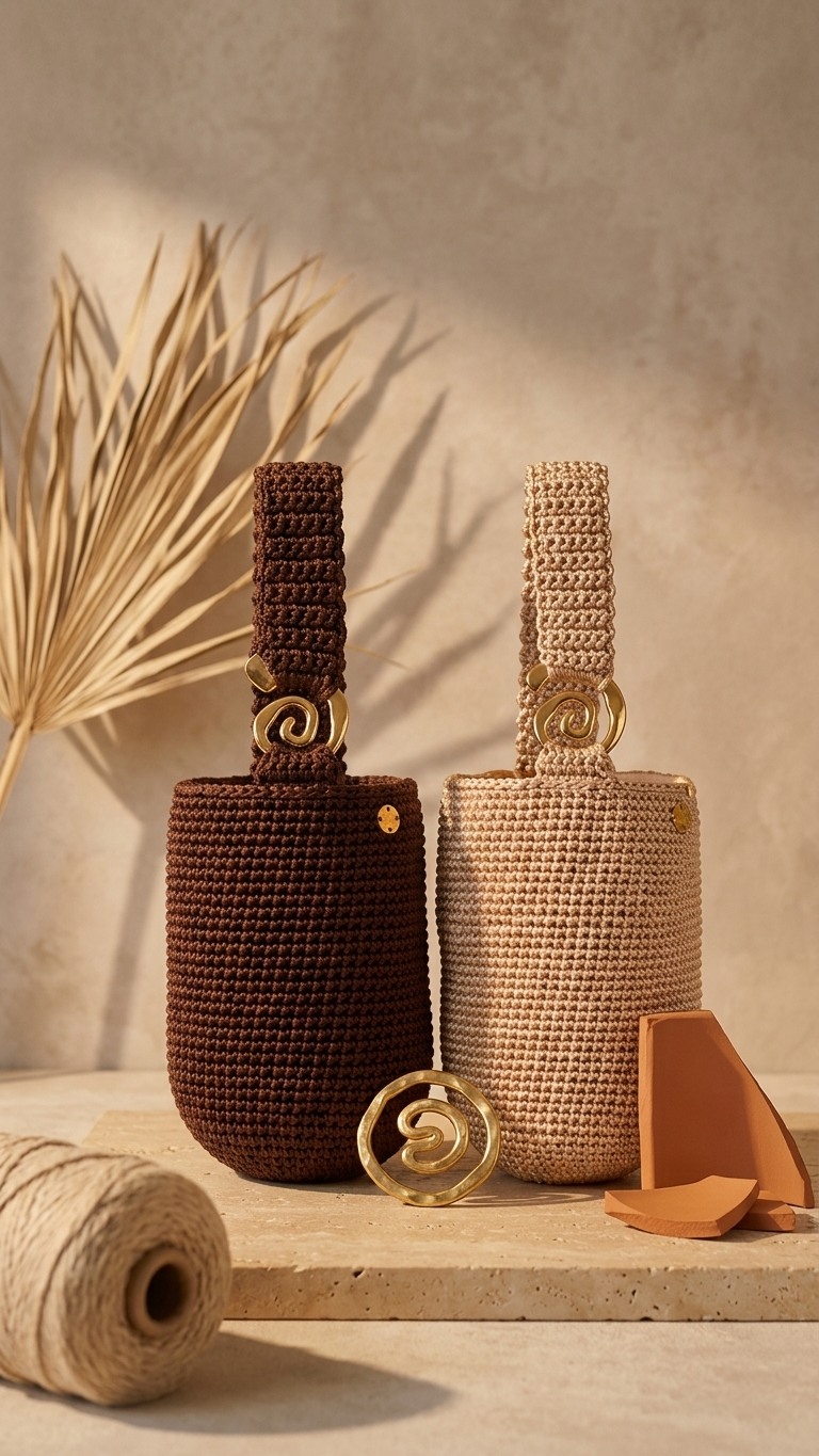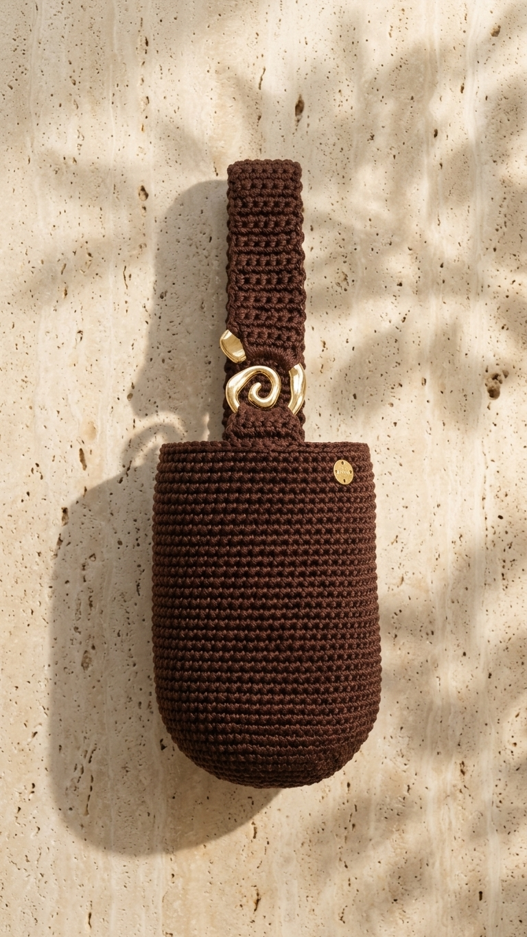 Nuestro bolso tipo bucket tejido a mano con herraje dorado espiral ha sido cuidadosamente fabricado a mano para ofrecerte una estructura firme pero flexible, ideal para la mujer que busca un accesorio con carácter, lujo discreto y un toque orgánico.